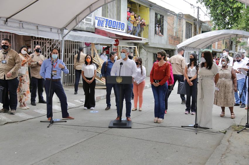 El presidente Iván Duque, junto con el ministro de Comercio, Industria y Turismo, José Manuel Restrepo, y la directora general de Prosperidad Social, Susana Correa Borrero, lanzaron este sábado, en Cali, la estrategia “Economía para la gente”, con la cual se apoyará la reactivación y fortalecimiento de las unidades productivas de población vulnerable y micro negocios formales e informales.
